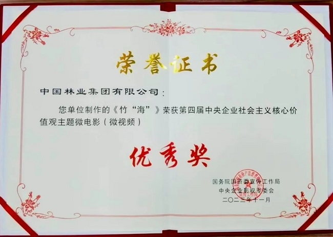 11月7日,国资委党委宣传部举办“大国顶梁柱 奋进新征程”第四届中央企业社会主义核心价值观主题微电影(微视频)展映发布活动,经过层层选拔,共评选出四个主题100部优秀作品,其中,中国林业集团选送的微电影作品《竹“海”》荣获社会责任类优秀奖。