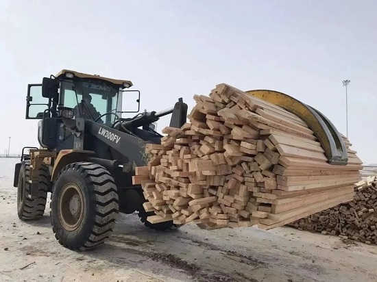 现场部装载机司机刘丛新驾驶装载机在1道60号货位装载木材。