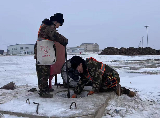 工程部孙东洋、于长胜爬冰卧雪检查2道1号地下消防栓是否泄露、冻堵。
