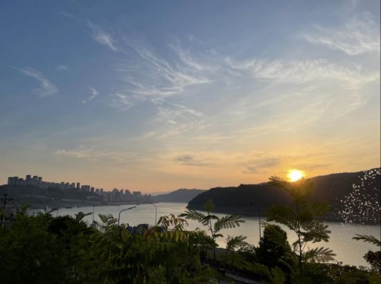 在重庆林投公司忠州国家储备林项目建设中,正值雨过天晴,虹消云散,阳光朗煦,落霞与孤雁辉映,秋天的江水和辽阔的天空连成一片,浑然一色。