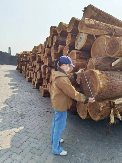 质量管理 测量先行 林场集团所属大连中林投资有限公司业务部职员正在检尺圆木,以确定规格,进行准确分类。(摄影:欧阳莹)