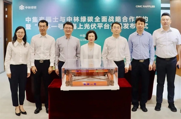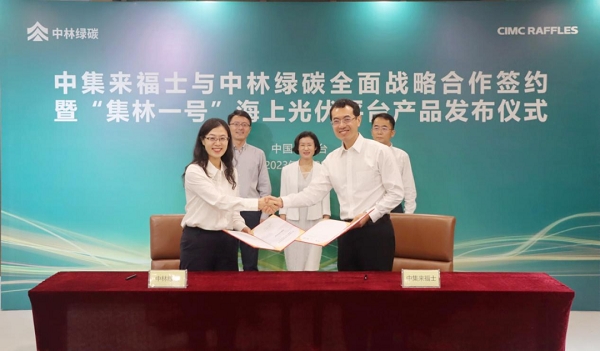 8月28日,中林集团所属中林绿碳(北京)科技有限公司与烟台中集来福士海洋科技集团在烟台中集海洋工程研究院签订战略合作协议,并正式发布了由双方共同合作研发的国内首个竹基海上光伏平台“集林一号”。本次发布标志着双方在绿色低碳海工装备研发制造领域取得重大突破,合作发展进入新阶段。中林集团党委委员、副总经理翁文林,中集来福士集团总裁王建中见证签约并共同为“集林一号”光伏平台揭牌。