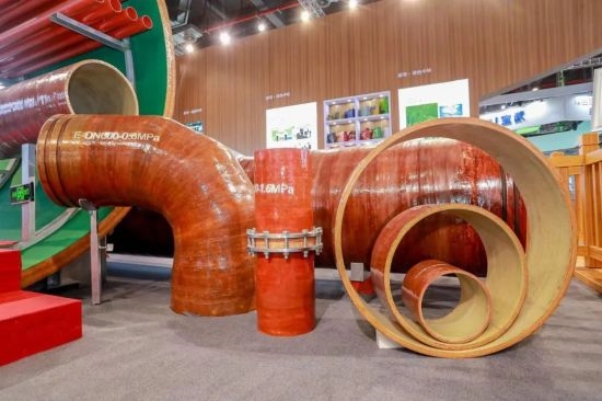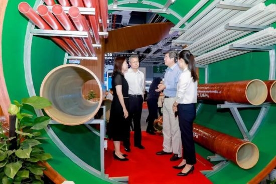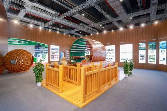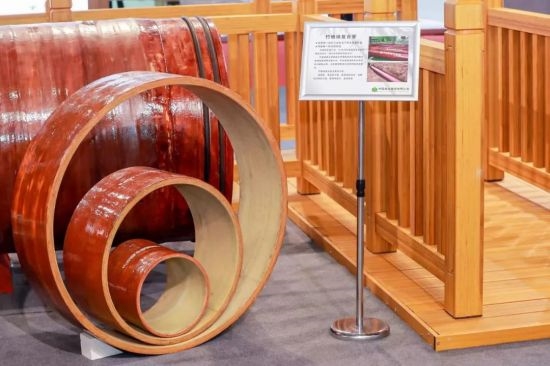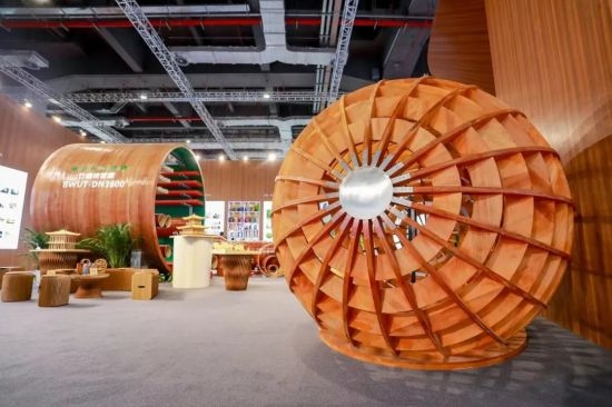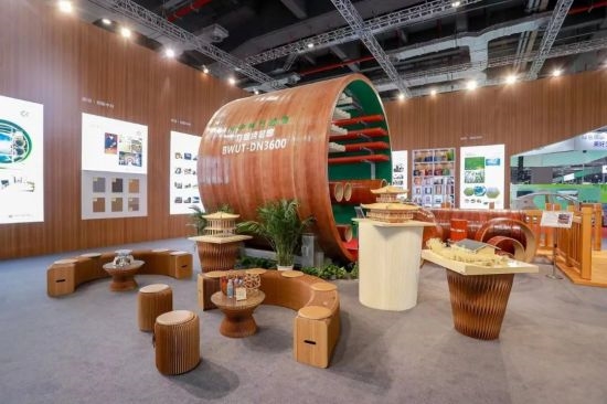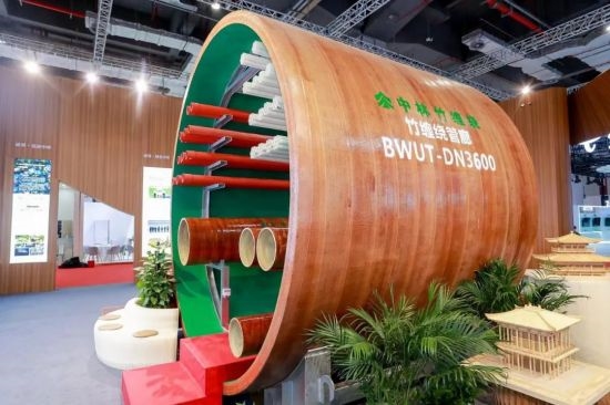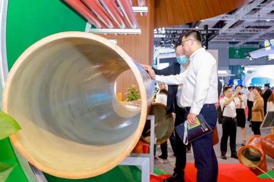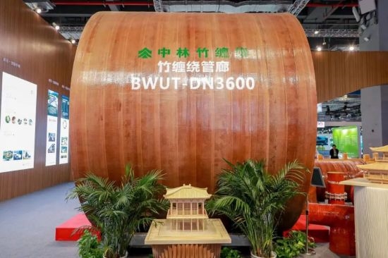竹缠绕管廊成为展厅“网红”产品 近年来,中林集团不断加强竹缠绕新型复合材料研发,为生物减碳固碳提供重要解决方案。在现场,一个直径为3.6m,长3m的竹缠绕管廊吸引了大家的注意,它是“以竹代塑”绿色低碳材料应用的创新与突破。与传统管廊相比,竹缠绕管廊材料成本可降低约10%,安装施工效率可提高约20%。竹缠绕管廊于2022年7月,在住建部的建设行业科技成果评估中被评为“技术达到世界领先水平”,并列入“十四五”生物经济发展规划。