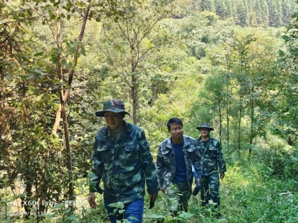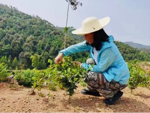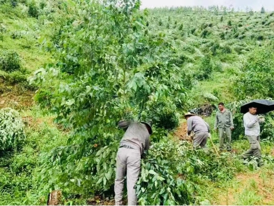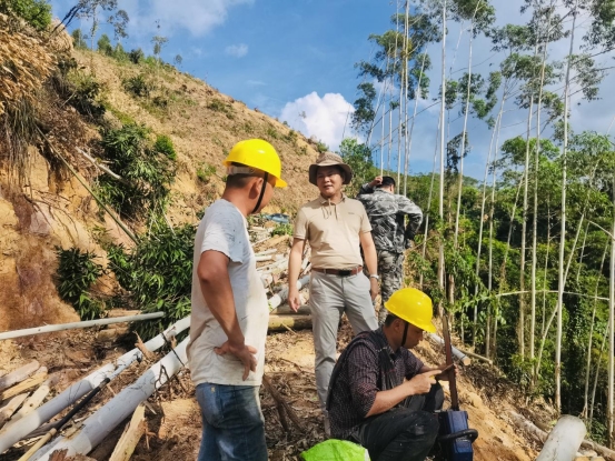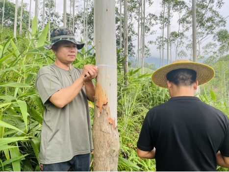 与林农沟通法拍接收事宜 在法拍林地接收谈判中,为了找依据、占先机,他每天都要咨询法务部负责人,自己翻阅法律书籍,以确保在一场场博弈中头脑清晰,有理有据,为公司争取更大的权益。 为确保工作正常开展,他趟河水、钻密林,在山高路远没有手机信号的林地,一待就是一整天。检查、砍草、除萌、挖肥料坑、检查工棚防火安全,身体力行,事无巨细。 他顶着近40°的高温,上山检查每一处肥料坑,冒着即使面临高温中暑的危险,也要坚持完成工作。他“特别能吃苦、特别愿付出”的工作精神感染着身边每一位同事。