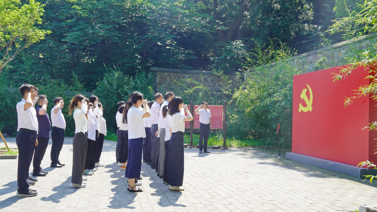 在双清别墅东侧平房(原中共中央警卫处),全体党员整齐列队,身姿挺拔,目光坚定。大家庄严地举起右拳,党委副书记、总经理吕锦程领誓,大家重温入党誓词。“我志愿加入中国共产党,拥护党的纲领,遵守党的章程,履行党员义务……”党员们神情庄重,铿锵有力的誓言在上空回荡。