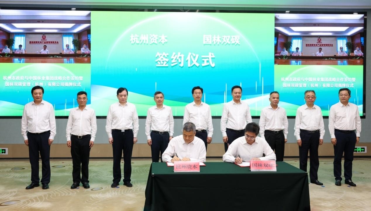 6月10日,中林集团与杭州市政府战略合作签约暨国林双碳管理(杭州)有限公司(以下简称“双碳”公司)揭牌仪式在北京、杭州两地以视频连线方式举行。国务院国资委党委委员、副主任翁杰明,浙江省委常委、常务副省长陈金彪,浙江省委常委、杭州市委书记刘捷,杭州市委副书记、市长刘忻,中林集团党委书记、董事长余红辉,中国国新党委书记、董事长周渝波,杭州市委常委、秘书长朱华,杭州市副市长胡伟出席。 根据协议,双方将在落实国家重点战略、推动中林优质资源集聚、打造两大“双碳”平台、开展生态领域合作、科技创新研发协作等方面携手共进、实现共赢。