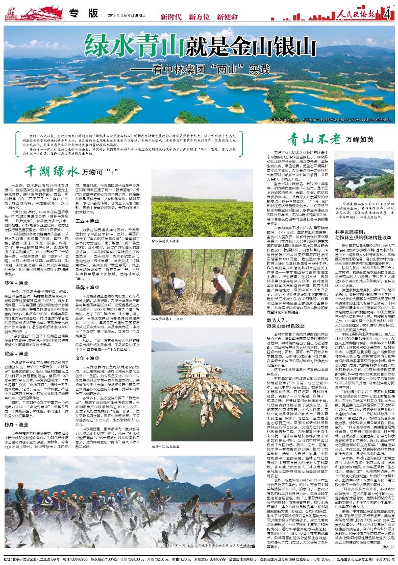 党的十八大以来,习近平总书记特别强调“绿水青山就是金山银山”的绿色可持续发展理念。特别是党的十九大,进一步明确了生态文明建设是关乎民族福祉的千年大计。在良好的生态环境基础上探索产业路径,创新产业模式,发展具有中国特色的美丽经济、生态经济已成为全民共识,我国生态产业正迎来快速发展的窗口期和机遇期。 作为唯一一家以林业为主业的中央企业,中国林业集团有限公司正承担起生态文明建设的使命要求,探索践行“两山”理论,努力为我国生态产业发展、推进生态文明建设做出贡献。 千湖绿水万物可“+” 千岛湖,位于浙江省杭州市淳安县境内。贫穷落后驱使当地居民一度走上毁林开荒、破坏生态的道路。曾经,郭沫若笔下的“西子三千个,群山已失高。峰峦成岛屿,平地卷波涛”,变成一湖污水。 上世纪90年代,中国林业集团所属杭州千岛湖发展集团公司(简称千发集团)“临危受命”,积极发挥资金技术、政策把握、市场熟悉等企业优势,助力地方践行绿色富民理念、实现生态脱贫。 中林集团以普通的鲢鳙鱼为基础,以保水为前提,形成集“养殖、管护、捕捞、销售、加工、烹饪、旅游、科研、文创”于一体的完整产业链。创造发展出“千岛湖模式”,并由此形成了“一湖推十湖,十湖带百湖”的“湖泊+”战略。目前已积极开展同江西鄱阳湖、阳明湖、湖北富水湖和丹江口水库等湖泊的合作,扎实推进我国大水面生态环境健康发展。 环保+渔业 曾经,千岛湖大量养殖银鱼、鲈鱼、鳜鱼等名贵鱼种,鲢鳙鱼数量急剧减少,导致蓝藻过度繁殖造成“水华”,引发水质问题。千发集团提出通过增加放养鲢鳙鱼来净化水质:鲢鳙鱼以滤食水中的浮游生物为饵料,能将水中的氮、磷等营养物质转化为鱼体蛋白质,同时通过科学合理的鱼货捕捞将其带出水体,有效提高水体的生物自净能力,最终实现经济发展与环境保护的统一。 “保水渔业”开创了千岛湖渔业健康发展的新路子,曾获得原国家环境保护总局颁发的环境保护科技成果奖。 旅游+渔业 千岛湖有一支由百余艘船只组成的专业捕捞队伍,新安江上留传的“九姓渔民”就是它的前身。船队的巨网捕鱼包是几代科研人员智慧的结晶,曾获得1978年全国科学大会奖。千发集团将这一“劳动场景”变成“旅游项目”,通过一系列技术攻关,定时、定点、定壮观度,将这个项目常态化开发。游客可直接参与到捕鱼中来,进行渔事体验。 同时,千岛湖还设立了中国第一个休闲渔业公园“千岛湖钓鱼岛”,将其发展成一个集知识性、趣味性、参与性于一体的鱼文化汇集景点。 修身+渔业 由于鲢鳙鱼平时无拘无束,捕捞后会不断地跳跃致使擦伤鱼体。为驯化野性便于运输和酒店小空间保活,强制鱼儿停食而又不致于饿死,保证去除鱼儿体内杂质,提高口感,千发集团在千岛湖中心湖区和东南湖区建了两个“静养基地”,专门用来静养捕捞过来的待售活鱼。网箱静养既是蓄积待运,又有锻炼鱼体、减脂瘦身、净化产品的作用,也防止了无谓的损耗,有利于提高经营效益,是养殖管理上的创新之举。 工业+渔业 为适应消费者多样化需求,千发集团制定了产品技术标准。此外,集团还进行了“鱼儿的供给侧改革”,借鉴庖丁解牛的方式进行“庖丁解鱼”:将一条鱼切割为13个部位。经过道道标准化的细致分割,千岛湖淳牌有机鱼就变成了淳鱼美食———鱼头成为“秀水砂锅鱼头”,鱼泡成为“秀水鱼鳔”,鱼块变成“淳牌东坡鱼”,鱼尾变成“群鱼献花”,就连鱼皮都被做成了“香菜鱼皮”等。一场与有机鱼最亲密的接触,使得寸鱼成“金”。 品牌+渔业 千岛湖鲢鳙鱼是喝农夫山泉,吃松花粉长大的,品质很高。为使千岛湖生产的鱼与其他同类鱼区分开,实现高品质生态产品溢价,2000年集团注册了“淳”牌商标。有了“淳”牌商标,并不等于有了品牌,考虑到农产品消费者特别关注产地,2003年,淳牌鱼正式通过了国家质检总局原产地注册,产品走向市场一律打上“千岛湖”原产地标志,正名为“千岛湖淳鱼”。 从此,“淳”牌有机鱼成为全国鲢鳙活鱼市场价格的风向标。千岛湖鱼头还上了G20国宴餐桌——“千岛扒鱼脸”。 文创+渔业 千岛湖淳牌有机鱼可以用来保护水质,可以用来食用,还可以用来从事文艺创作———鱼拓。为传承鱼文化,2008年,千发集团成立了第一家千岛湖鱼拓社,先后创作作品千余幅,作品还代表中国鱼拓艺术精品多次在国内外参展,受到各国鱼拓艺术家的好评。 多管齐下,生态经济发挥了“乘数效应”,带动了当地经济社会快速发展,千岛湖涉鱼产业规模每年达10亿元左右,形成了几处成规模的“吃鱼一条街”,鱼头菜肴风靡全国,旅游业快速发展,年接待游客超过10万人次,生态旅游收入1.5亿元。 因效果显著,集团被评为“最具影响力水产品企业品牌”称号,荣获“浙江省卓越经营奖”。这一模式也因其借鉴参考意义,成为中央党校“两山”高水平转化教学案例。 青山不老万峰如茵 习近平总书记多次对长江经济带生态环境保护工作作出重要指示,强调推动长江经济带发展,理念要先进,坚持生态优先、绿色发展,把生态环境保护摆在优先地位,涉及长江的一切经济活动都要以不破坏生态环境为前提,共抓大保护,不搞大开发。 重庆市以山城扬名,是我国中西部唯一的直辖市和国家中心城市,是长江上游地区的经济